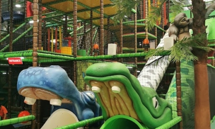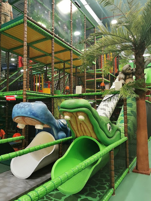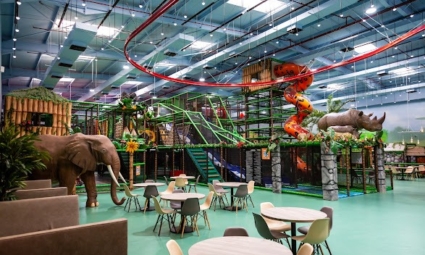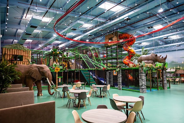 A jungle-themed zone with slides, rope bridges, tunnels, balance beams, and spider towers, plus a foam cannon area and sledging slope for extra fun.